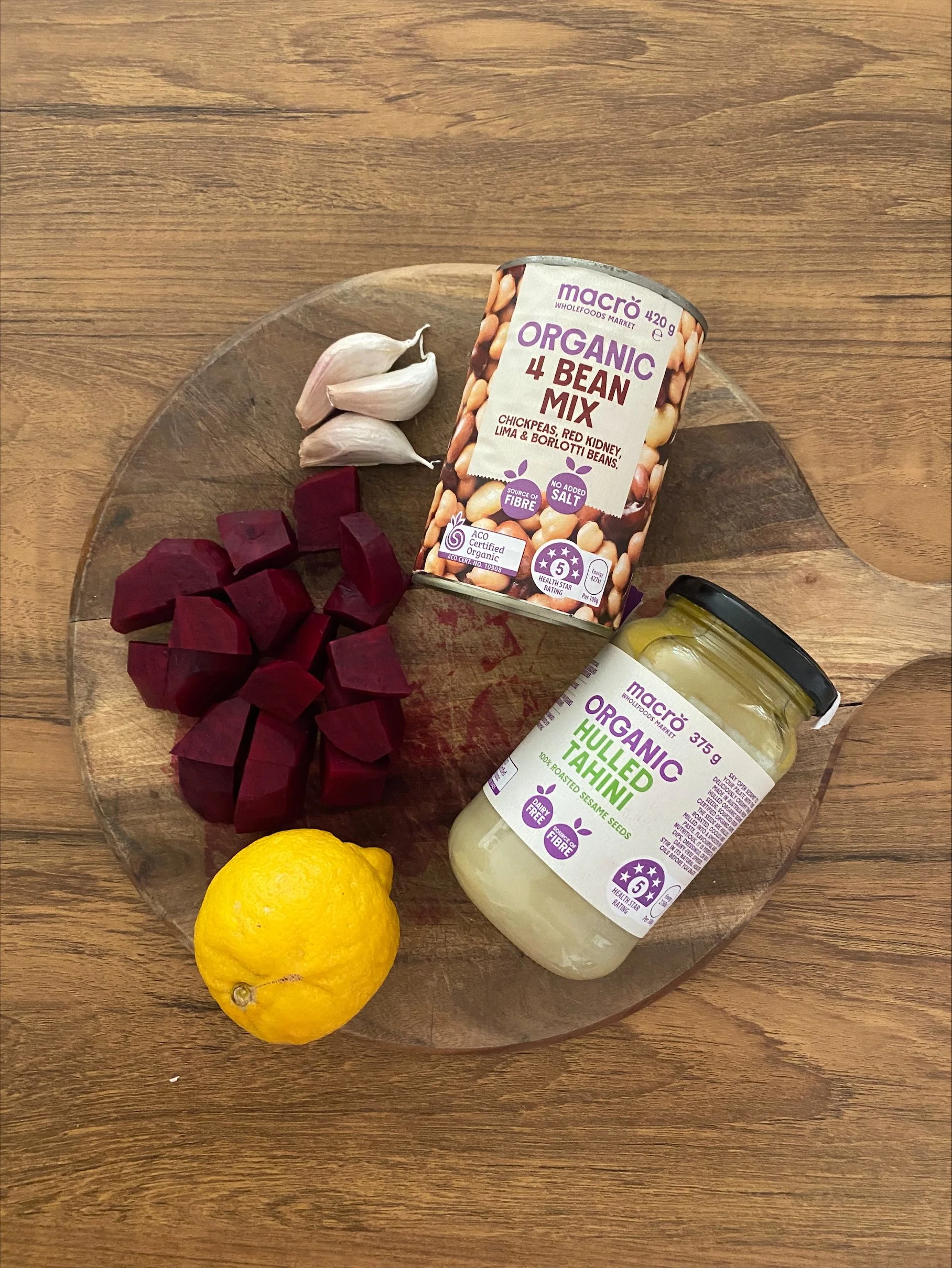 In a food processor, combine the roasted beetroot, garlic, beans, tahini, olive oil, lemon juice, and salt.